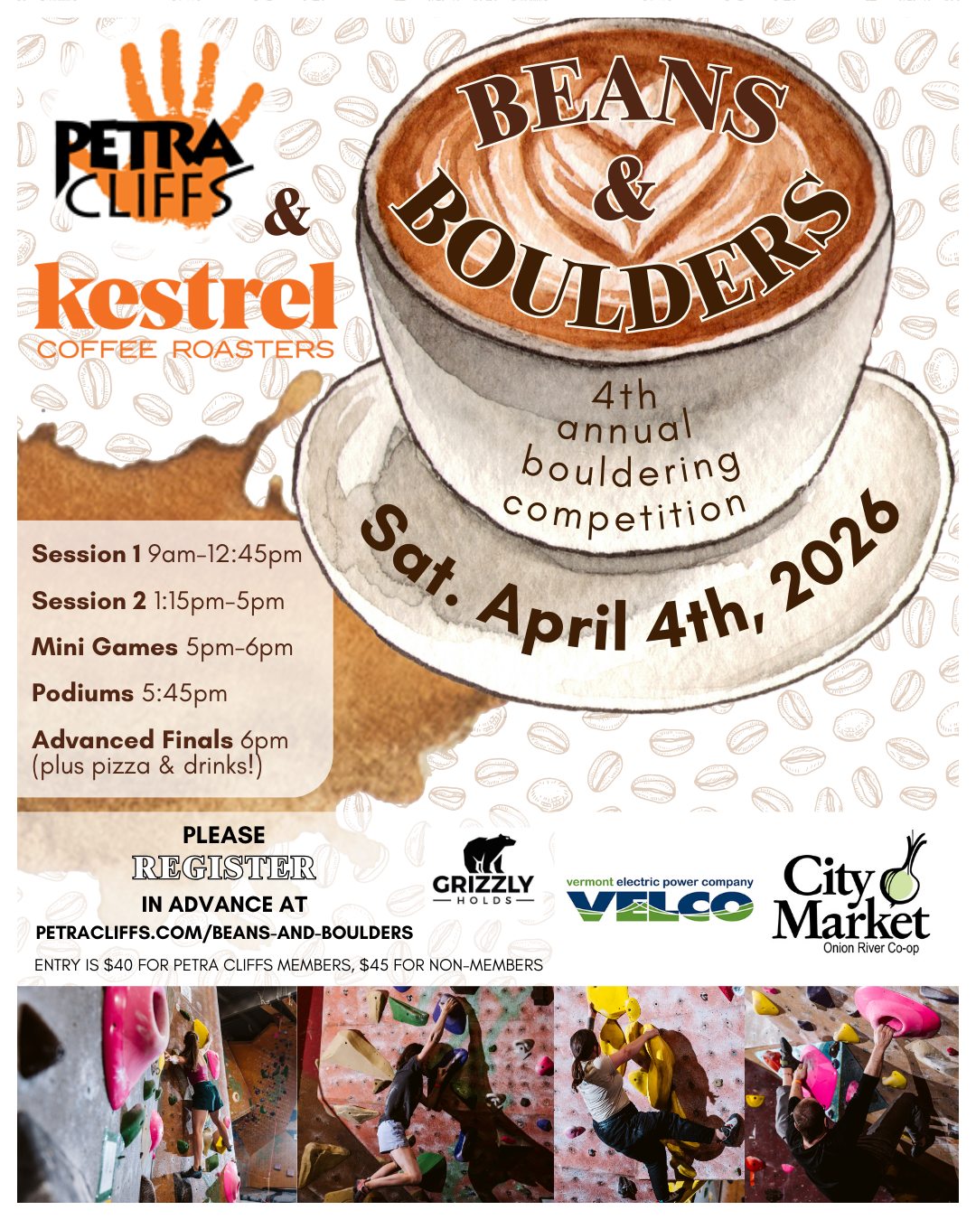 Saturday April 4th, 2026BEANS & BOULDERSPetra Cliffs’ Annual Bouldering Competition Register for AM climbing Session Register for PM climbing session Presented by: Additional support from: