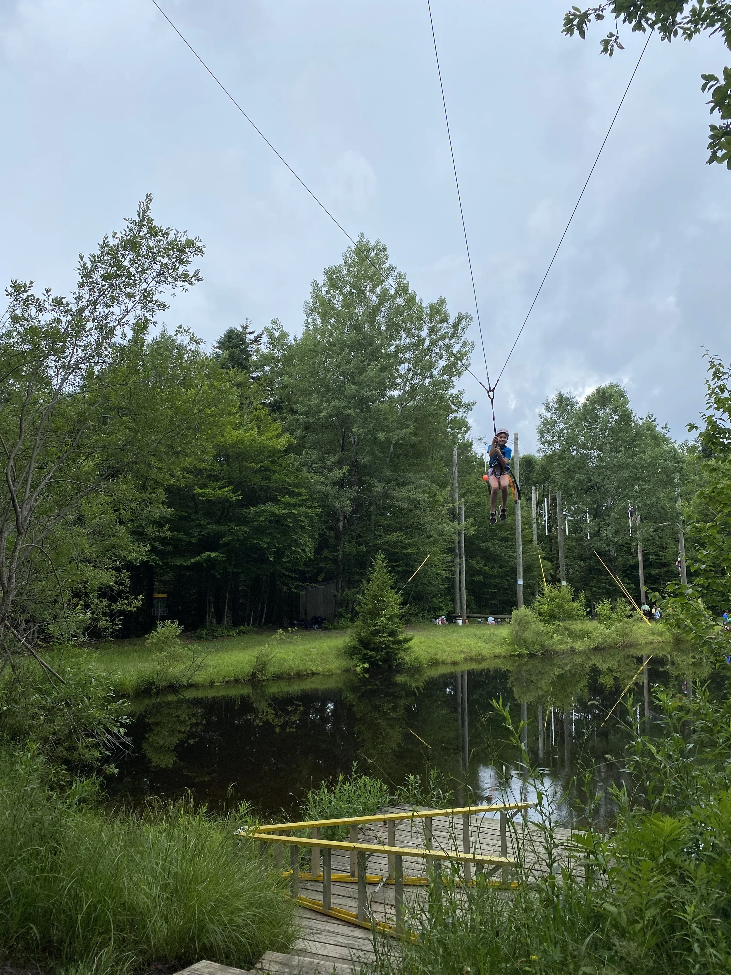 The course is in a beautiful wooded area off the Nordic ski trails. The high course includes a four-part circuit with balancing elements that is 30 feet off the ground, and a Giant Swing element.